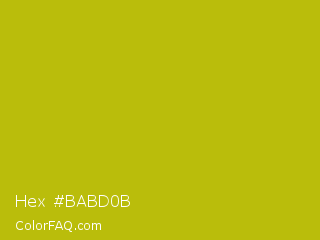 Hex #babd0b Color is a normal yellow color and the nearest color is La Rioja #b3c110. Hex code #babd0b and RGB value is rgb(186,189,11). In RGB color space, this color is composed of 73% red, 74% green, 4% blue, In CMYK color space, this color is composed of 2% cyan, 0% magenta, 94% yellow , 26% black , In HSL color space, this color has a hue angle of 61° , 89% saturation and 39% lightness.