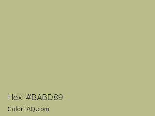Hex #babd89 Color is a light yellow color and the nearest color is Sage #bcb88a. Hex code #babd89 and RGB value is rgb(186,189,137). In RGB color space, this color is composed of 73% red, 74% green, 54% blue, In CMYK color space, this color is composed of 2% cyan, 0% magenta, 28% yellow , 26% black , In HSL color space, this color has a hue angle of 63° , 28% saturation and 64% lightness.