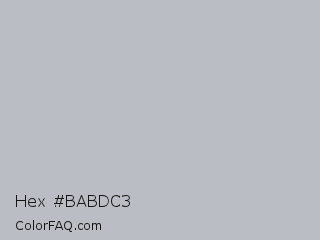 Hex #babdc3 Color is a light blue color and the nearest color is French Gray #bdbdc6. Hex code #babdc3 and RGB value is rgb(186,189,195). In RGB color space, this color is composed of 73% red, 74% green, 76% blue, In CMYK color space, this color is composed of 5% cyan, 3% magenta, 0% yellow , 24% black , In HSL color space, this color has a hue angle of 220° , 7% saturation and 75% lightness.