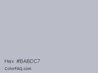 Hex #babdc7 Color is a light blue color and the nearest color is French Gray #bdbdc6. Hex code #babdc7 and RGB value is rgb(186,189,199). In RGB color space, this color is composed of 73% red, 74% green, 78% blue, In CMYK color space, this color is composed of 7% cyan, 5% magenta, 0% yellow , 22% black , In HSL color space, this color has a hue angle of 226° , 10% saturation and 75% lightness.