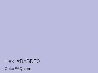 Hex #babde0 Color is a light blue color and the nearest color is Blue Haze #bfbed8. Hex code #babde0 and RGB value is rgb(186,189,224). In RGB color space, this color is composed of 73% red, 74% green, 88% blue, In CMYK color space, this color is composed of 17% cyan, 16% magenta, 0% yellow , 12% black , In HSL color space, this color has a hue angle of 235° , 38% saturation and 80% lightness.
