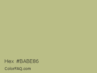 Hex #babe86 Color is a light yellow color and the nearest color is Sage #bcb88a. Hex code #babe86 and RGB value is rgb(186,190,134). In RGB color space, this color is composed of 73% red, 75% green, 53% blue, In CMYK color space, this color is composed of 2% cyan, 0% magenta, 29% yellow , 25% black , In HSL color space, this color has a hue angle of 64° , 30% saturation and 64% lightness.