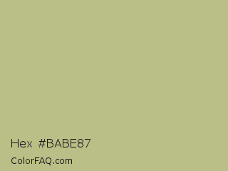 Hex #babe87 Color is a light yellow color and the nearest color is Sage #bcb88a. Hex code #babe87 and RGB value is rgb(186,190,135). In RGB color space, this color is composed of 73% red, 75% green, 53% blue, In CMYK color space, this color is composed of 2% cyan, 0% magenta, 29% yellow , 25% black , In HSL color space, this color has a hue angle of 64° , 30% saturation and 64% lightness.