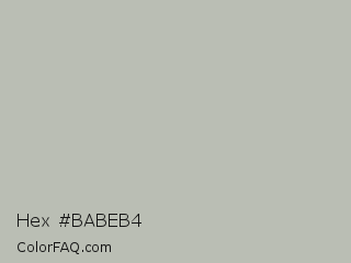 Hex #babeb4 Color is a light green color and the nearest color is Green Spring #b8c1b1. Hex code #babeb4 and RGB value is rgb(186,190,180). In RGB color space, this color is composed of 73% red, 75% green, 71% blue, In CMYK color space, this color is composed of 2% cyan, 0% magenta, 5% yellow , 25% black , In HSL color space, this color has a hue angle of 84° , 7% saturation and 73% lightness.