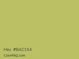Hex #bac164 Color is a normal yellow color and the nearest color is Wild Willow #b9c46a. Hex code #bac164 and RGB value is rgb(186,193,100). In RGB color space, this color is composed of 73% red, 76% green, 39% blue, In CMYK color space, this color is composed of 4% cyan, 0% magenta, 48% yellow , 24% black , In HSL color space, this color has a hue angle of 65° , 43% saturation and 57% lightness.