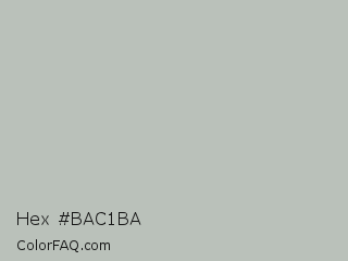 Hex #bac1ba Color is a light green color and the nearest color is Gray X11 Gray #bebebe. Hex code #bac1ba and RGB value is rgb(186,193,186). In RGB color space, this color is composed of 73% red, 76% green, 73% blue, In CMYK color space, this color is composed of 4% cyan, 0% magenta, 4% yellow , 24% black , In HSL color space, this color has a hue angle of 120° , 5% saturation and 74% lightness.