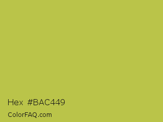 Hex #bac449 Color is a normal yellow color and the nearest color is Turmeric #cabb48. Hex code #bac449 and RGB value is rgb(186,196,73). In RGB color space, this color is composed of 73% red, 77% green, 29% blue, In CMYK color space, this color is composed of 5% cyan, 0% magenta, 63% yellow , 23% black , In HSL color space, this color has a hue angle of 65° , 51% saturation and 53% lightness.