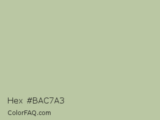Hex #bac7a3 Color is a light green color and the nearest color is Rainee #b9c8ac. Hex code #bac7a3 and RGB value is rgb(186,199,163). In RGB color space, this color is composed of 73% red, 78% green, 64% blue, In CMYK color space, this color is composed of 7% cyan, 0% magenta, 18% yellow , 22% black , In HSL color space, this color has a hue angle of 82° , 24% saturation and 71% lightness.