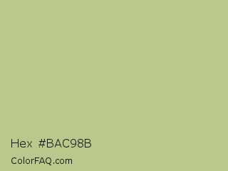 Hex #bac98b Color is a light lime color and the nearest color is Pine Glade #c7cd90. Hex code #bac98b and RGB value is rgb(186,201,139). In RGB color space, this color is composed of 73% red, 79% green, 55% blue, In CMYK color space, this color is composed of 7% cyan, 0% magenta, 31% yellow , 21% black , In HSL color space, this color has a hue angle of 75° , 36% saturation and 67% lightness.