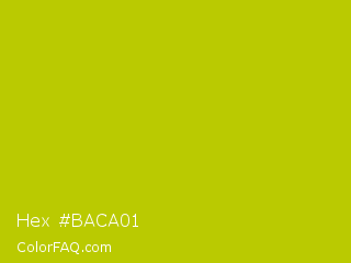Hex #baca01 Color is a normal yellow color and the nearest color is Rio Grande #bbd009. Hex code #baca01 and RGB value is rgb(186,202,1). In RGB color space, this color is composed of 73% red, 79% green, 0% blue, In CMYK color space, this color is composed of 8% cyan, 0% magenta, 100% yellow , 21% black , In HSL color space, this color has a hue angle of 65° , 99% saturation and 40% lightness.