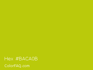 Hex #baca0b Color is a normal yellow color and the nearest color is Rio Grande #bbd009. Hex code #baca0b and RGB value is rgb(186,202,11). In RGB color space, this color is composed of 73% red, 79% green, 4% blue, In CMYK color space, this color is composed of 8% cyan, 0% magenta, 95% yellow , 21% black , In HSL color space, this color has a hue angle of 65° , 90% saturation and 42% lightness.