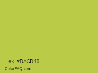 Hex #bacb48 Color is a normal yellow color and the nearest color is June Bud #bdda57. Hex code #bacb48 and RGB value is rgb(186,203,72). In RGB color space, this color is composed of 73% red, 80% green, 28% blue, In CMYK color space, this color is composed of 8% cyan, 0% magenta, 65% yellow , 20% black , In HSL color space, this color has a hue angle of 68° , 56% saturation and 54% lightness.