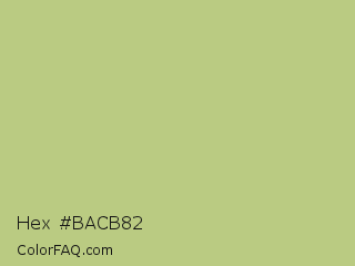 Hex #bacb82 Color is a light lime color and the nearest color is Pine Glade #c7cd90. Hex code #bacb82 and RGB value is rgb(186,203,130). In RGB color space, this color is composed of 73% red, 80% green, 51% blue, In CMYK color space, this color is composed of 8% cyan, 0% magenta, 36% yellow , 20% black , In HSL color space, this color has a hue angle of 74° , 41% saturation and 65% lightness.