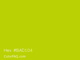 Hex #bad104 Color is a normal yellow color and the nearest color is Rio Grande #bbd009. Hex code #bad104 and RGB value is rgb(186,209,4). In RGB color space, this color is composed of 73% red, 82% green, 2% blue, In CMYK color space, this color is composed of 11% cyan, 0% magenta, 98% yellow , 18% black , In HSL color space, this color has a hue angle of 67° , 96% saturation and 42% lightness.