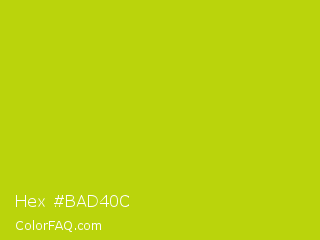 Hex #bad40c Color is a normal yellow color and the nearest color is Rio Grande #bbd009. Hex code #bad40c and RGB value is rgb(186,212,12). In RGB color space, this color is composed of 73% red, 83% green, 5% blue, In CMYK color space, this color is composed of 12% cyan, 0% magenta, 94% yellow , 17% black , In HSL color space, this color has a hue angle of 68° , 89% saturation and 44% lightness.