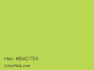 Hex #bad754 Color is a normal lime color and the nearest color is June Bud #bdda57. Hex code #bad754 and RGB value is rgb(186,215,84). In RGB color space, this color is composed of 73% red, 84% green, 33% blue, In CMYK color space, this color is composed of 13% cyan, 0% magenta, 61% yellow , 16% black , In HSL color space, this color has a hue angle of 73° , 62% saturation and 59% lightness.