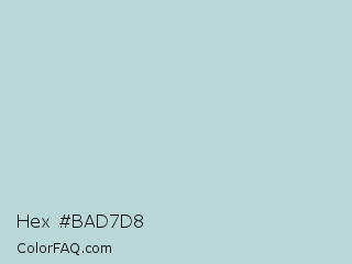 Hex #bad7d8 Color is a light cyan color and the nearest color is Jungle Mist #b4cfd3. Hex code #bad7d8 and RGB value is rgb(186,215,216). In RGB color space, this color is composed of 73% red, 84% green, 85% blue, In CMYK color space, this color is composed of 14% cyan, 0% magenta, 0% yellow , 15% black , In HSL color space, this color has a hue angle of 182° , 28% saturation and 79% lightness.