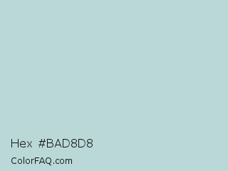 Hex #bad8d8 Color is a light cyan color and the nearest color is Ziggurat #bfdbe2. Hex code #bad8d8 and RGB value is rgb(186,216,216). In RGB color space, this color is composed of 73% red, 85% green, 85% blue, In CMYK color space, this color is composed of 14% cyan, 0% magenta, 0% yellow , 15% black , In HSL color space, this color has a hue angle of 180° , 28% saturation and 79% lightness.