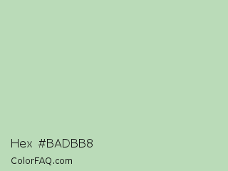 Hex #badbb8 Color is a light green color and the nearest color is Pixie Green #c0d8b6. Hex code #badbb8 and RGB value is rgb(186,219,184). In RGB color space, this color is composed of 73% red, 86% green, 72% blue, In CMYK color space, this color is composed of 15% cyan, 0% magenta, 16% yellow , 14% black , In HSL color space, this color has a hue angle of 117° , 33% saturation and 79% lightness.