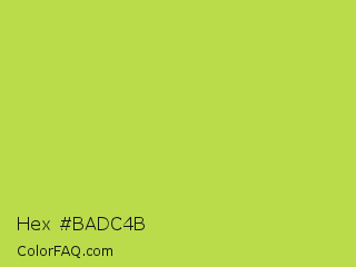 Hex #badc4b Color is a normal lime color and the nearest color is June Bud #bdda57. Hex code #badc4b and RGB value is rgb(186,220,75). In RGB color space, this color is composed of 73% red, 86% green, 29% blue, In CMYK color space, this color is composed of 15% cyan, 0% magenta, 66% yellow , 14% black , In HSL color space, this color has a hue angle of 74° , 67% saturation and 58% lightness.