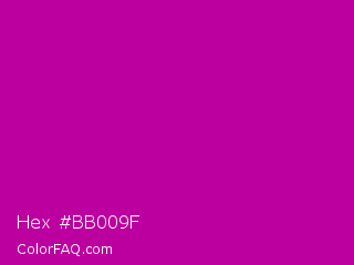 Hex #bb009f Color is a normal magenta color and the nearest color is Heliotrope Magenta #aa00bb. Hex code #bb009f and RGB value is rgb(187,0,159). In RGB color space, this color is composed of 73% red, 0% green, 62% blue, In CMYK color space, this color is composed of 0% cyan, 100% magenta, 15% yellow , 27% black , In HSL color space, this color has a hue angle of 309° , 100% saturation and 37% lightness.