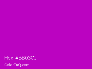 Hex #bb03c1 Color is a normal magenta color and the nearest color is Heliotrope Magenta #aa00bb. Hex code #bb03c1 and RGB value is rgb(187,3,193). In RGB color space, this color is composed of 73% red, 1% green, 76% blue, In CMYK color space, this color is composed of 3% cyan, 98% magenta, 0% yellow , 24% black , In HSL color space, this color has a hue angle of 298° , 97% saturation and 38% lightness.