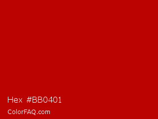 Hex #bb0401 Color is a normal red color and the nearest color is Guardsman Red #ba0101. Hex code #bb0401 and RGB value is rgb(187,4,1). In RGB color space, this color is composed of 73% red, 2% green, 0% blue, In CMYK color space, this color is composed of 0% cyan, 98% magenta, 99% yellow , 27% black , In HSL color space, this color has a hue angle of 1° , 99% saturation and 37% lightness.