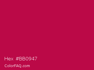 Hex #bb0947 Color is a normal rose color and the nearest color is Pictorial Carmine #c30b4e. Hex code #bb0947 and RGB value is rgb(187,9,71). In RGB color space, this color is composed of 73% red, 4% green, 28% blue, In CMYK color space, this color is composed of 0% cyan, 95% magenta, 62% yellow , 27% black , In HSL color space, this color has a hue angle of 339° , 91% saturation and 38% lightness.
