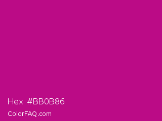 Hex #bb0b86 Color is a normal magenta color and the nearest color is Red Violet #c71585. Hex code #bb0b86 and RGB value is rgb(187,11,134). In RGB color space, this color is composed of 73% red, 4% green, 53% blue, In CMYK color space, this color is composed of 0% cyan, 94% magenta, 28% yellow , 27% black , In HSL color space, this color has a hue angle of 318° , 89% saturation and 39% lightness.