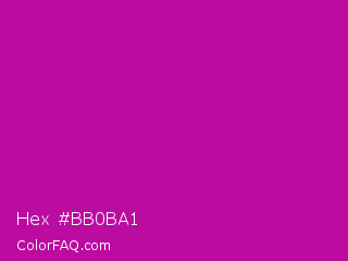 Hex #bb0ba1 Color is a normal magenta color and the nearest color is Red Violet #c71585. Hex code #bb0ba1 and RGB value is rgb(187,11,161). In RGB color space, this color is composed of 73% red, 4% green, 63% blue, In CMYK color space, this color is composed of 0% cyan, 94% magenta, 14% yellow , 27% black , In HSL color space, this color has a hue angle of 309° , 89% saturation and 39% lightness.