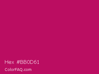 Hex #bb0d61 Color is a normal rose color and the nearest color is Lipstick #ab0563. Hex code #bb0d61 and RGB value is rgb(187,13,97). In RGB color space, this color is composed of 73% red, 5% green, 38% blue, In CMYK color space, this color is composed of 0% cyan, 93% magenta, 48% yellow , 27% black , In HSL color space, this color has a hue angle of 331° , 87% saturation and 39% lightness.