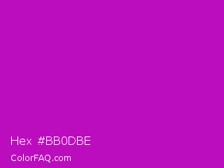 Hex #bb0dbe Color is a normal magenta color and the nearest color is Heliotrope Magenta #aa00bb. Hex code #bb0dbe and RGB value is rgb(187,13,190). In RGB color space, this color is composed of 73% red, 5% green, 75% blue, In CMYK color space, this color is composed of 2% cyan, 93% magenta, 0% yellow , 25% black , In HSL color space, this color has a hue angle of 299° , 87% saturation and 40% lightness.