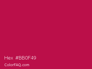 Hex #bb0f49 Color is a normal rose color and the nearest color is Pictorial Carmine #c30b4e. Hex code #bb0f49 and RGB value is rgb(187,15,73). In RGB color space, this color is composed of 73% red, 6% green, 29% blue, In CMYK color space, this color is composed of 0% cyan, 92% magenta, 61% yellow , 27% black , In HSL color space, this color has a hue angle of 340° , 85% saturation and 40% lightness.
