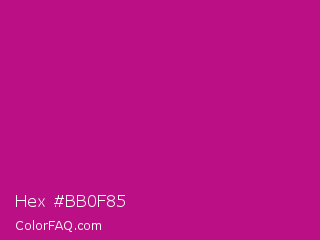 Hex #bb0f85 Color is a normal magenta color and the nearest color is Red Violet #c71585. Hex code #bb0f85 and RGB value is rgb(187,15,133). In RGB color space, this color is composed of 73% red, 6% green, 52% blue, In CMYK color space, this color is composed of 0% cyan, 92% magenta, 29% yellow , 27% black , In HSL color space, this color has a hue angle of 319° , 85% saturation and 40% lightness.