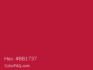 Hex #bb1737 Color is a normal red color and the nearest color is Cardinal #c41e3a. Hex code #bb1737 and RGB value is rgb(187,23,55). In RGB color space, this color is composed of 73% red, 9% green, 22% blue, In CMYK color space, this color is composed of 0% cyan, 88% magenta, 71% yellow , 27% black , In HSL color space, this color has a hue angle of 348° , 78% saturation and 41% lightness.