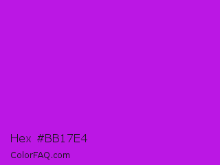 Hex #bb17e4 Color is a normal purple color and the nearest color is Vivid Mulberry #b80ce3. Hex code #bb17e4 and RGB value is rgb(187,23,228). In RGB color space, this color is composed of 73% red, 9% green, 89% blue, In CMYK color space, this color is composed of 18% cyan, 90% magenta, 0% yellow , 11% black , In HSL color space, this color has a hue angle of 288° , 82% saturation and 49% lightness.