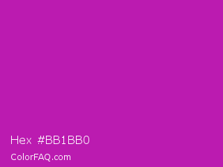 Hex #bb1bb0 Color is a normal magenta color and the nearest color is Byzantine #bd33a4. Hex code #bb1bb0 and RGB value is rgb(187,27,176). In RGB color space, this color is composed of 73% red, 11% green, 69% blue, In CMYK color space, this color is composed of 0% cyan, 86% magenta, 6% yellow , 27% black , In HSL color space, this color has a hue angle of 304° , 75% saturation and 42% lightness.