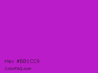 Hex #bb1cc9 Color is a normal magenta color and the nearest color is Steel Pink #cc33cc. Hex code #bb1cc9 and RGB value is rgb(187,28,201). In RGB color space, this color is composed of 73% red, 11% green, 79% blue, In CMYK color space, this color is composed of 7% cyan, 86% magenta, 0% yellow , 21% black , In HSL color space, this color has a hue angle of 295° , 76% saturation and 45% lightness.