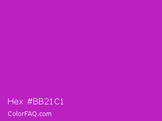 Hex #bb21c1 Color is a normal magenta color and the nearest color is Steel Pink #cc33cc. Hex code #bb21c1 and RGB value is rgb(187,33,193). In RGB color space, this color is composed of 73% red, 13% green, 76% blue, In CMYK color space, this color is composed of 3% cyan, 83% magenta, 0% yellow , 24% black , In HSL color space, this color has a hue angle of 298° , 71% saturation and 44% lightness.