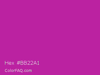 Hex #bb22a1 Color is a normal magenta color and the nearest color is Byzantine #bd33a4. Hex code #bb22a1 and RGB value is rgb(187,34,161). In RGB color space, this color is composed of 73% red, 13% green, 63% blue, In CMYK color space, this color is composed of 0% cyan, 82% magenta, 14% yellow , 27% black , In HSL color space, this color has a hue angle of 310° , 69% saturation and 43% lightness.