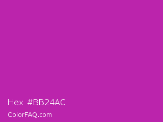 Hex #bb24ac Color is a normal magenta color and the nearest color is Byzantine #bd33a4. Hex code #bb24ac and RGB value is rgb(187,36,172). In RGB color space, this color is composed of 73% red, 14% green, 67% blue, In CMYK color space, this color is composed of 0% cyan, 81% magenta, 8% yellow , 27% black , In HSL color space, this color has a hue angle of 306° , 68% saturation and 44% lightness.