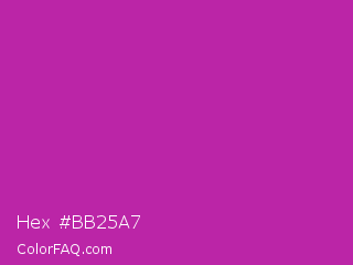 Hex #bb25a7 Color is a normal magenta color and the nearest color is Byzantine #bd33a4. Hex code #bb25a7 and RGB value is rgb(187,37,167). In RGB color space, this color is composed of 73% red, 15% green, 65% blue, In CMYK color space, this color is composed of 0% cyan, 80% magenta, 11% yellow , 27% black , In HSL color space, this color has a hue angle of 308° , 67% saturation and 44% lightness.