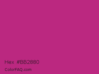 Hex #bb2880 Color is a normal magenta color and the nearest color is Medium Red Violet #bb3385. Hex code #bb2880 and RGB value is rgb(187,40,128). In RGB color space, this color is composed of 73% red, 16% green, 50% blue, In CMYK color space, this color is composed of 0% cyan, 79% magenta, 32% yellow , 27% black , In HSL color space, this color has a hue angle of 324° , 65% saturation and 45% lightness.