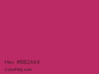 Hex #bb2a64 Color is a normal rose color and the nearest color is Hibiscus #b6316c. Hex code #bb2a64 and RGB value is rgb(187,42,100). In RGB color space, this color is composed of 73% red, 16% green, 39% blue, In CMYK color space, this color is composed of 0% cyan, 78% magenta, 47% yellow , 27% black , In HSL color space, this color has a hue angle of 336° , 63% saturation and 45% lightness.