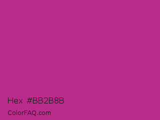 Hex #bb2b8b Color is a normal magenta color and the nearest color is Medium Red Violet #bb3385. Hex code #bb2b8b and RGB value is rgb(187,43,139). In RGB color space, this color is composed of 73% red, 17% green, 55% blue, In CMYK color space, this color is composed of 0% cyan, 77% magenta, 26% yellow , 27% black , In HSL color space, this color has a hue angle of 320° , 63% saturation and 45% lightness.