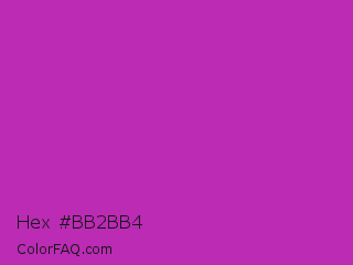 Hex #bb2bb4 Color is a normal magenta color and the nearest color is Byzantine #bd33a4. Hex code #bb2bb4 and RGB value is rgb(187,43,180). In RGB color space, this color is composed of 73% red, 17% green, 71% blue, In CMYK color space, this color is composed of 0% cyan, 77% magenta, 4% yellow , 27% black , In HSL color space, this color has a hue angle of 303° , 63% saturation and 45% lightness.