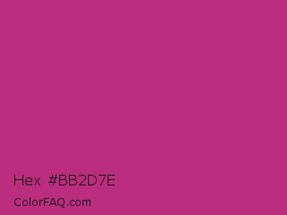 Hex #bb2d7e Color is a normal magenta color and the nearest color is Medium Red Violet #bb3385. Hex code #bb2d7e and RGB value is rgb(187,45,126). In RGB color space, this color is composed of 73% red, 18% green, 49% blue, In CMYK color space, this color is composed of 0% cyan, 76% magenta, 33% yellow , 27% black , In HSL color space, this color has a hue angle of 326° , 61% saturation and 45% lightness.