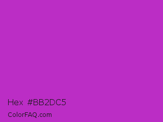 Hex #bb2dc5 Color is a normal magenta color and the nearest color is Steel Pink #cc33cc. Hex code #bb2dc5 and RGB value is rgb(187,45,197). In RGB color space, this color is composed of 73% red, 18% green, 77% blue, In CMYK color space, this color is composed of 5% cyan, 77% magenta, 0% yellow , 23% black , In HSL color space, this color has a hue angle of 296° , 63% saturation and 47% lightness.