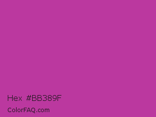 Hex #bb389f Color is a normal magenta color and the nearest color is Byzantine #bd33a4. Hex code #bb389f and RGB value is rgb(187,56,159). In RGB color space, this color is composed of 73% red, 22% green, 62% blue, In CMYK color space, this color is composed of 0% cyan, 70% magenta, 15% yellow , 27% black , In HSL color space, this color has a hue angle of 313° , 54% saturation and 48% lightness.