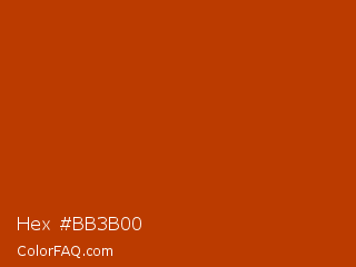 Hex #bb3b00 Color is a normal orange color and the nearest color is Mahogany #c04000. Hex code #bb3b00 and RGB value is rgb(187,59,0). In RGB color space, this color is composed of 73% red, 23% green, 0% blue, In CMYK color space, this color is composed of 0% cyan, 68% magenta, 100% yellow , 27% black , In HSL color space, this color has a hue angle of 19° , 100% saturation and 37% lightness.